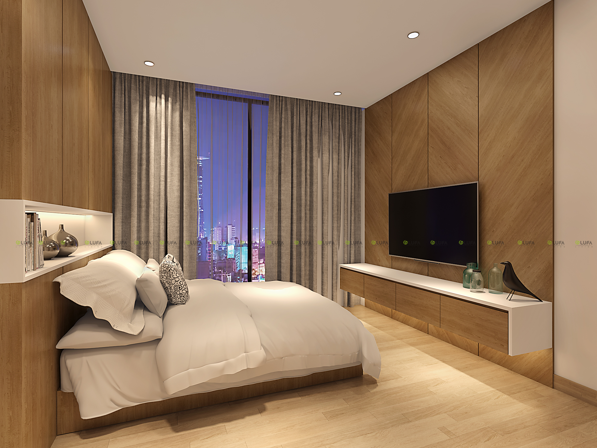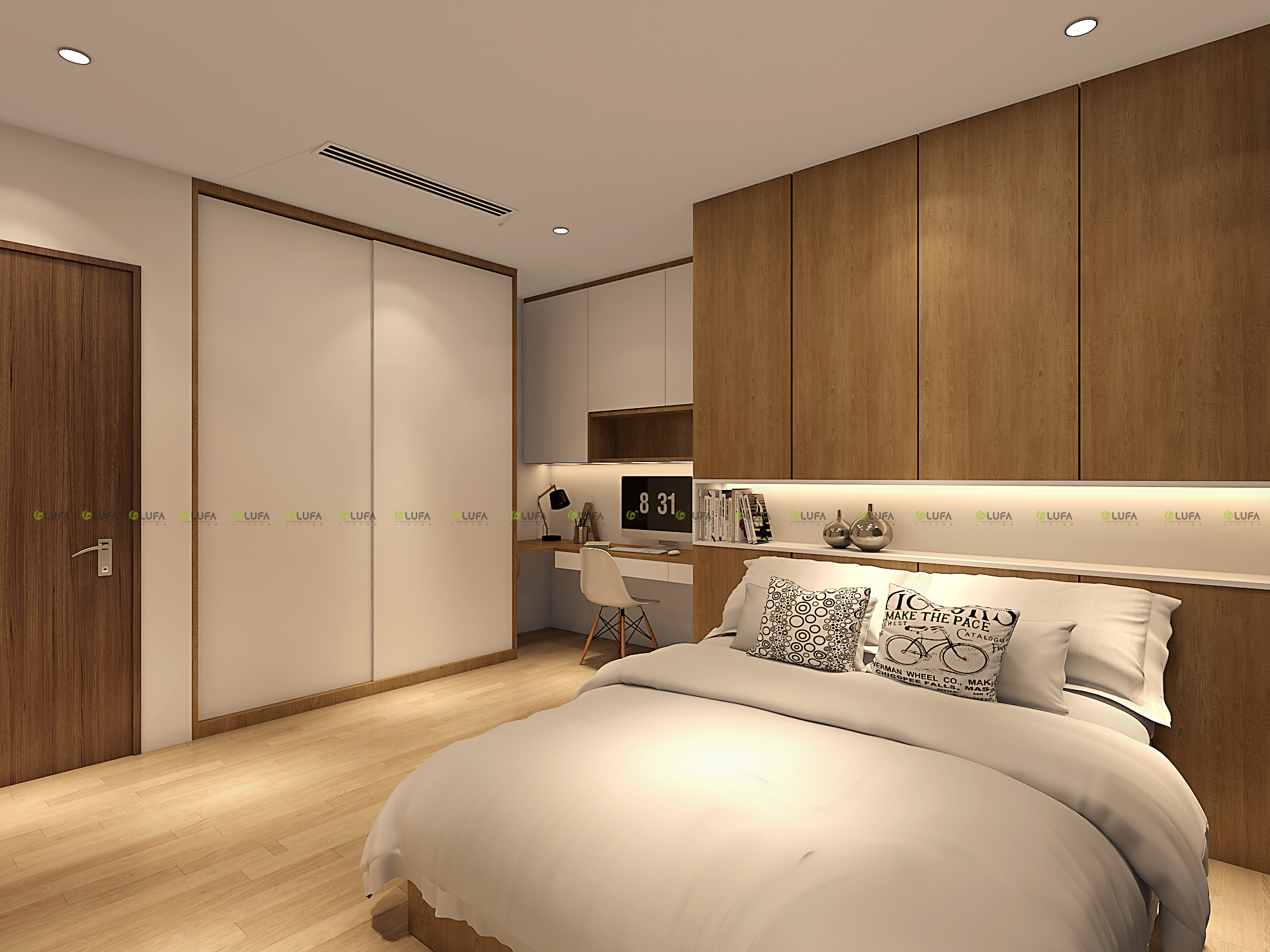 Không gian riêng tư rất quan trọng là nơi để gia chủ nghỉ ngơi. Bố trí nội thất khá đơn giản nhưng điểm nhấn là những mảng Laminate vân gỗ sáng kết nối với tổng thể nội thất bên ngoài phòng khách. Kết hợp với không gian đầu giường là hộc đầu giường vừa để trang trí vừa là nơi để vật dụng như những quyển sách đồng hồ...vv, góp phần cho giấc ngủ sâu cho gia chủ.