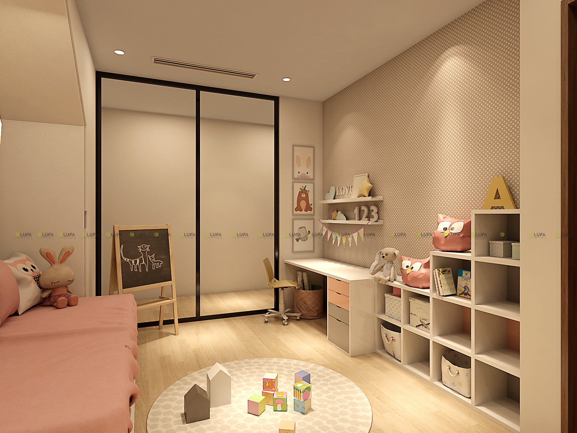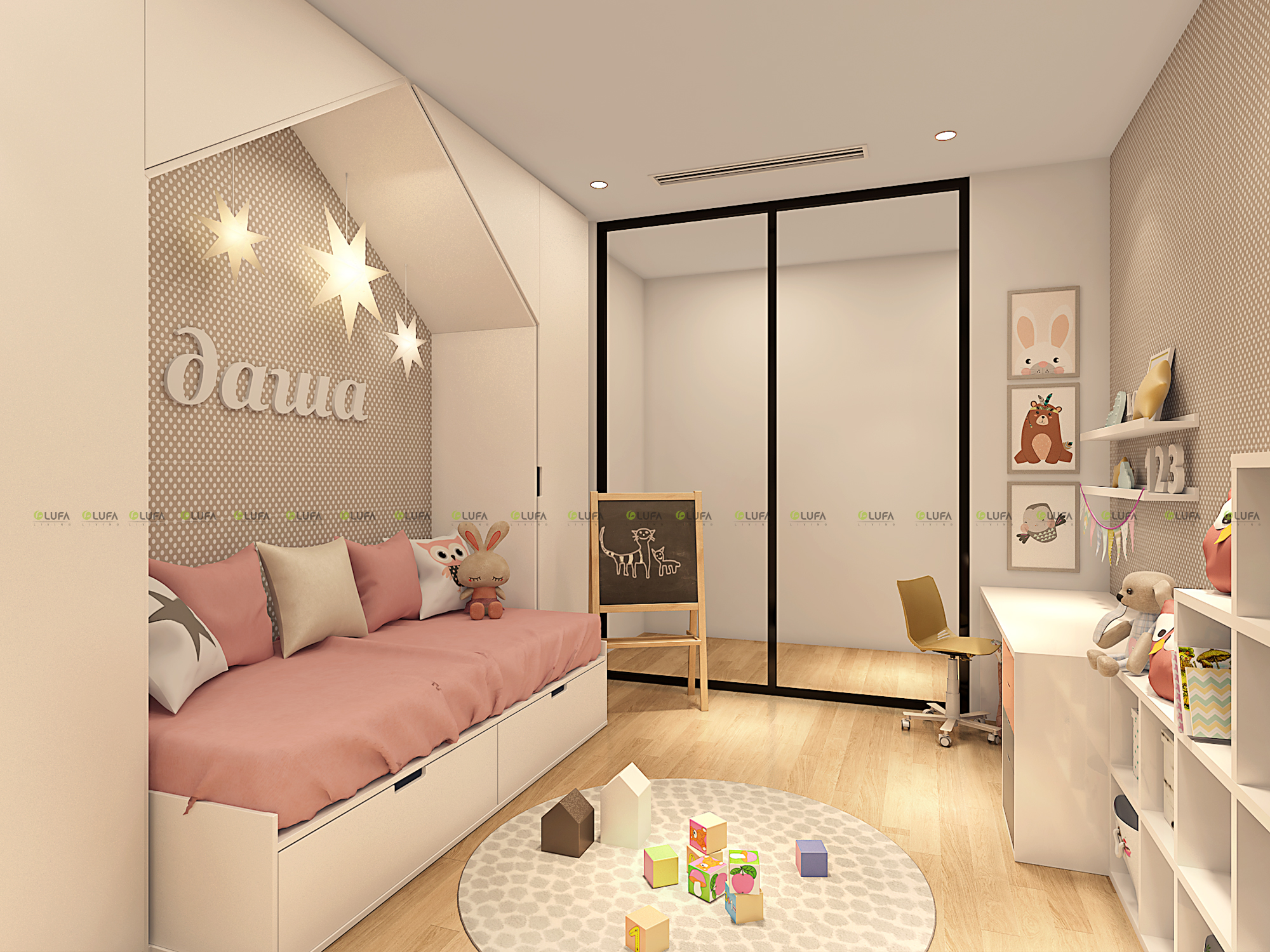 Với mảng cửa kính trong xuyên suốt, không gian của bé vừa thoáng vừa được mở ra giúp cho sự " quan tâm " từ bố mẹ được dễ dàng hơn.
