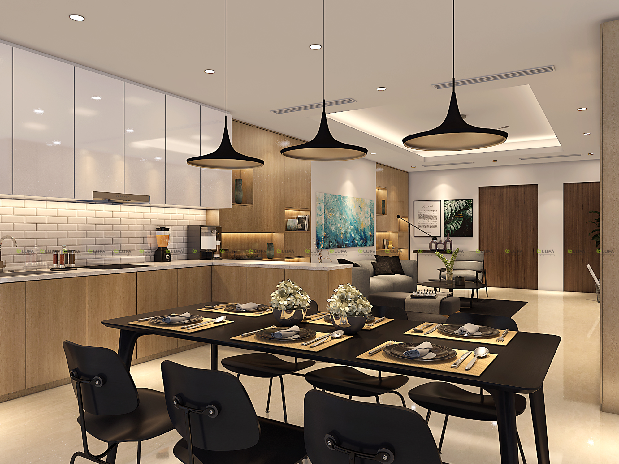 Căn hộ chỉ có một không gian sinh hoạt nên không gian hơi tù túng. Vì vậy, LUFA và gia chủ thống nhất phương án phá đi mảng tường ngăn chật chội giữa căn bếp và phòng khách, thay vào đó là hệ tủ quầy bar , nới rộng ánh nhìn cho căn hộ.