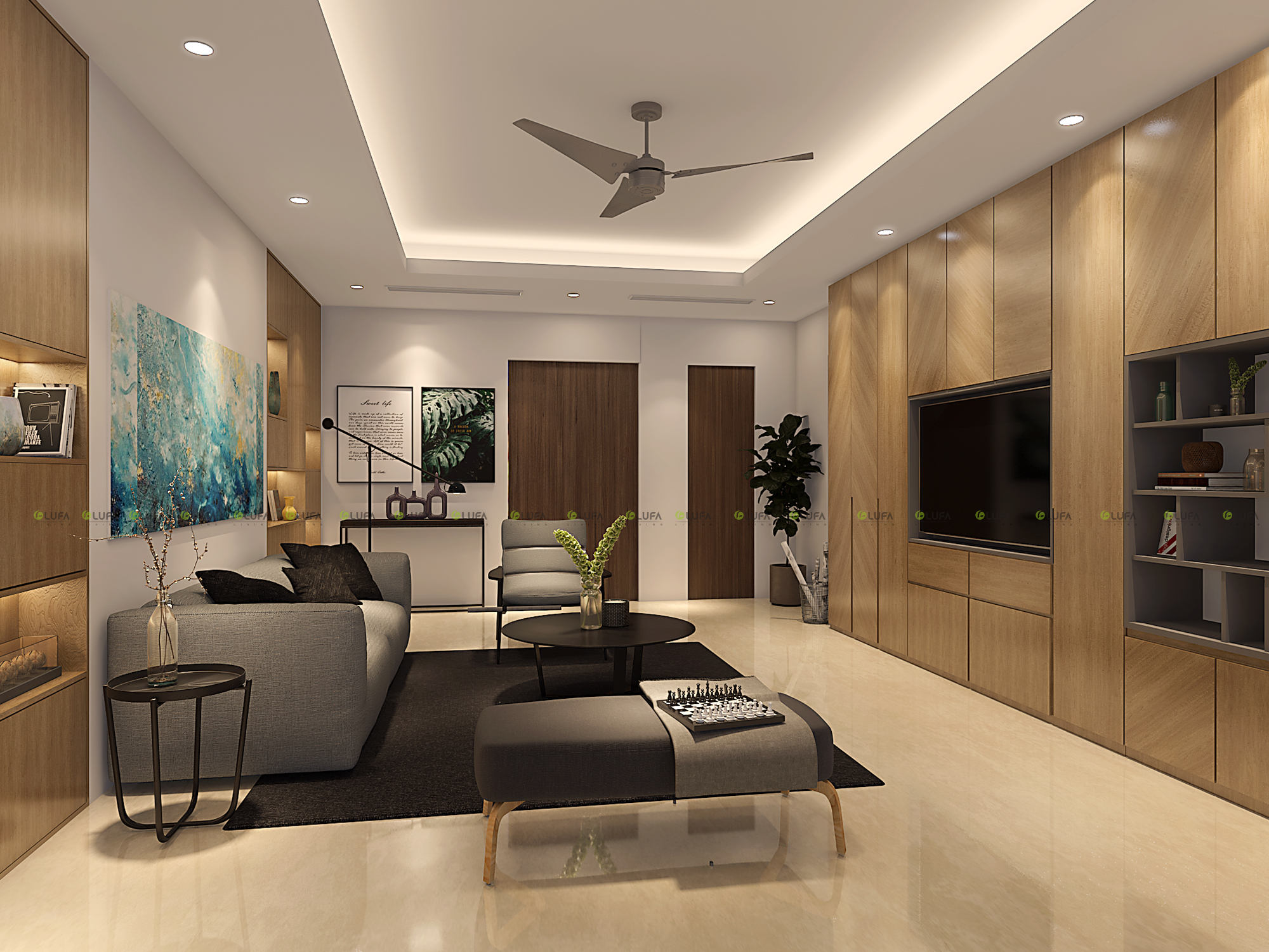 Vách ốp gỗ sau kệ ti vi được sắp đặt vân gỗ chữ V khá tốt tạo nên một không gian cá tính nhưng vẫn giữ được sự sang trọng mà gia chủ mong muốn. Không gian mở với màu rèm ghi đá tạo nên tổng thể khá hài hòa và hợp lí cho mắt nhìn.