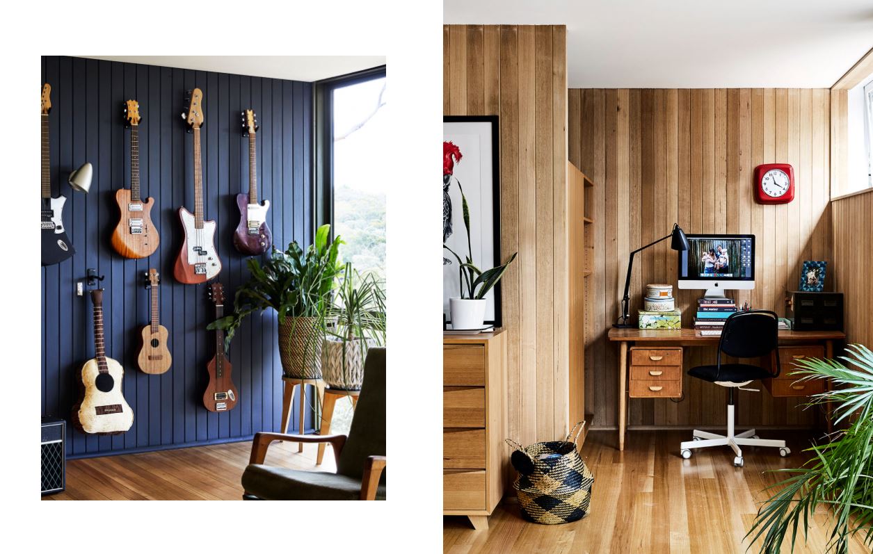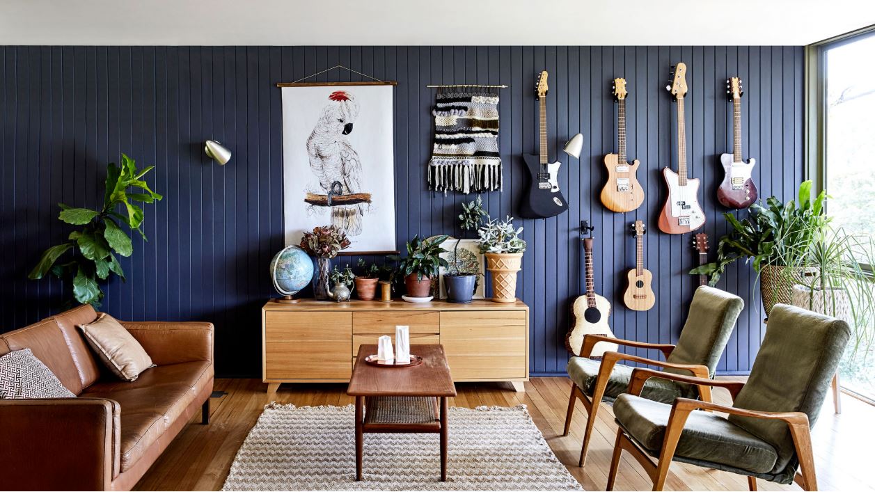 Phòng khách. Đàn ghi ta và tủ bếp tro Victoria do Lee chế tạo, tấm thảm dệt bởi Emma được treo trên bức tường cạnh những chiếc đàn. Ghế da từ ông nội Axe . Bàn cà phê và ghế màu xanh lá cây được tìm thấy ở bên đường và được tái chế bởi Lee.