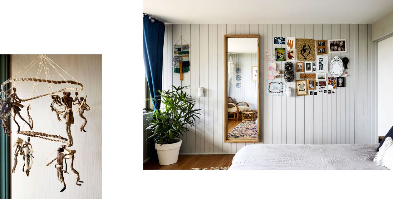 Đèn tường nguyên bản và sàn gỗ Tasmania Oak. Cặp vợ chồng sơn cửa tủ đựng thức ăn để phá bỏ không gian đầy gỗ trong nhà. Những chiếc giỏ được thu thập trong nhiều năm nay cất những đồ thể thao và quần áo mùa đông của bọn trẻ. Tác phẩm nghệ thuật bên cạnh tủ lạnh là một món quà từ bạn bè của Ace Wagstaff và Sam George.