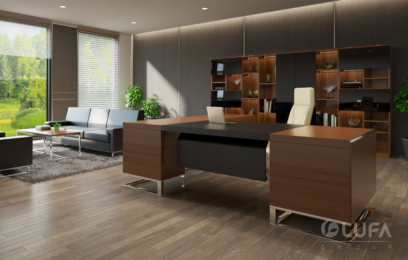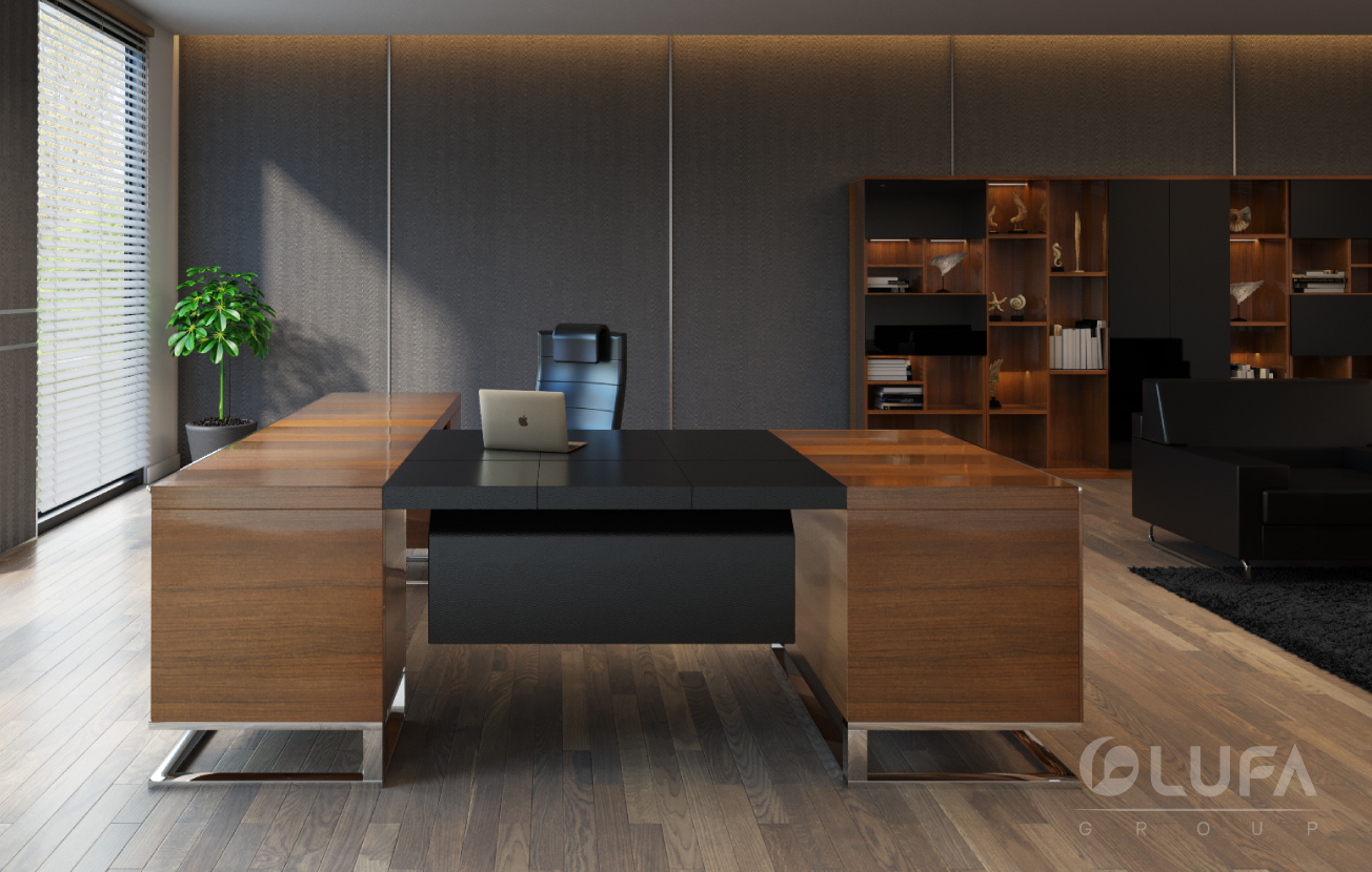 Được thiết kế theo phong cách tối giản nổi bật với chân bàn và ốp cạnh nổi bật cùng inox sáng bóng kết hợp chất liệu laminate cao cấp. Hệ tủ tài liệu nhiều ngăn thể hiện sự tiện dụng và mang tính décor cho cả không gian chung. Tất cả toát lên sự tinh tế và phong cách của người đứng đầu.