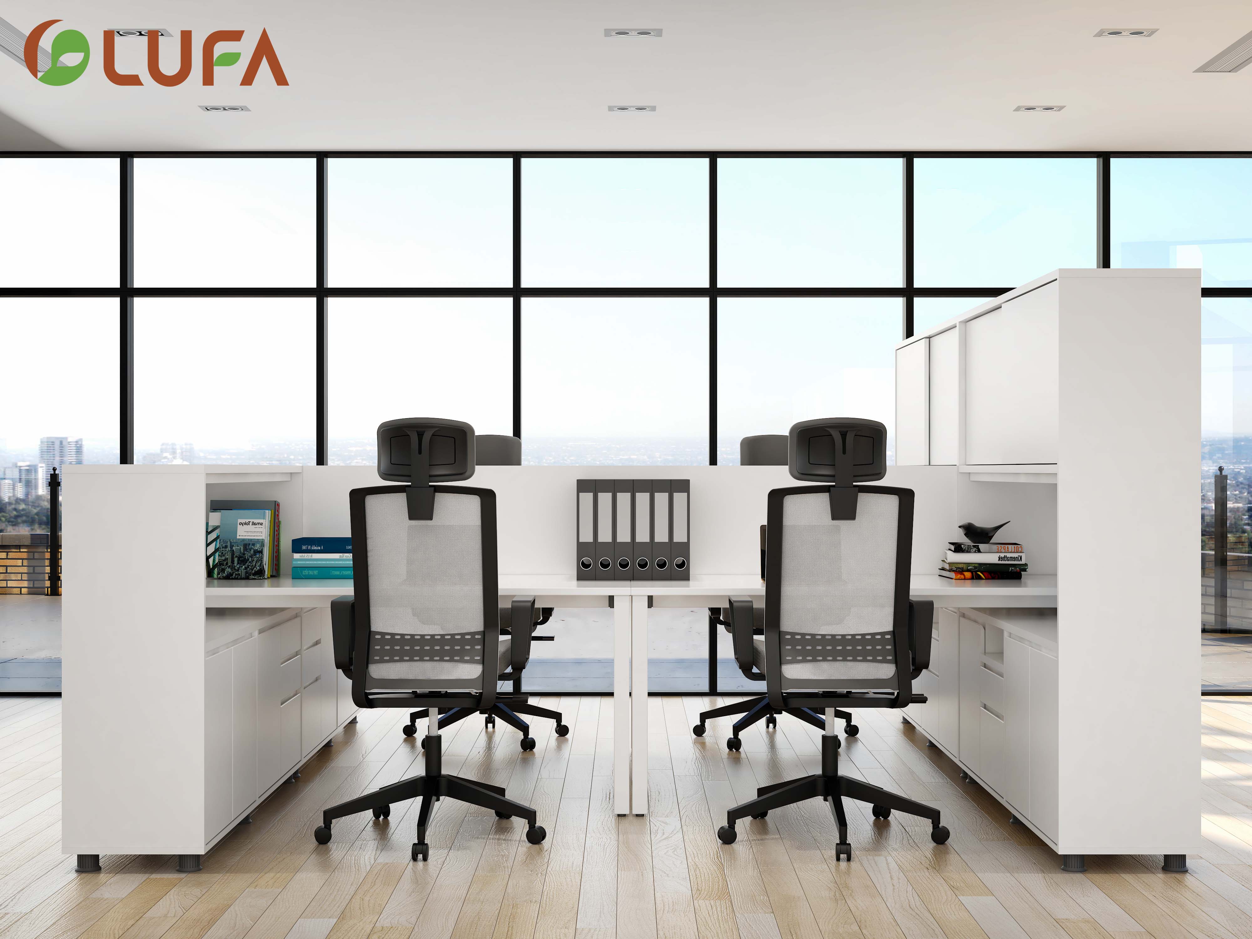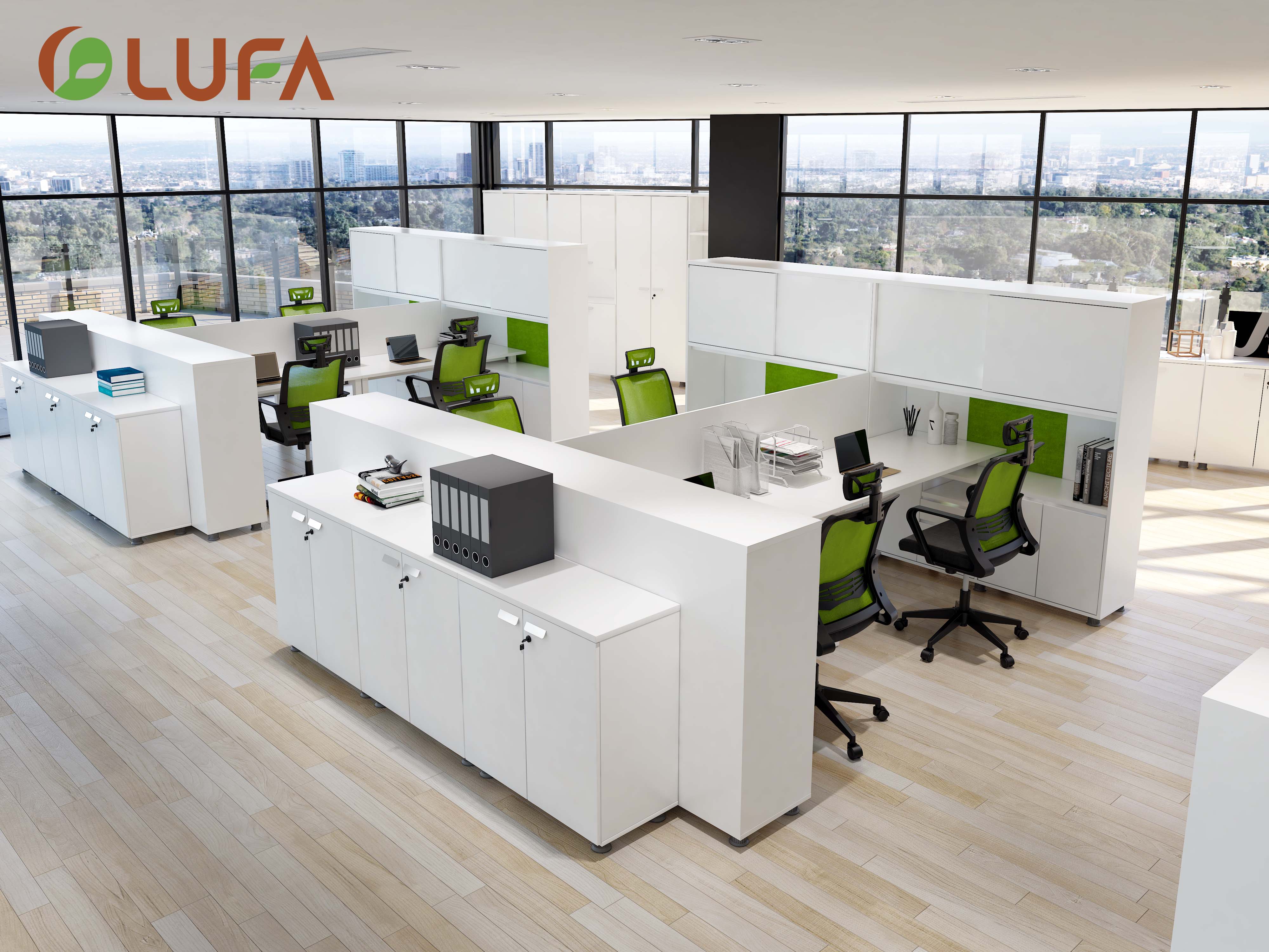 Hệ bàn, cabinet sử dụng kết hợp nhằm tối ưu diện tích văn phòng, vách ngăn thấp nhằm tạo không gian trao đổi nhóm.