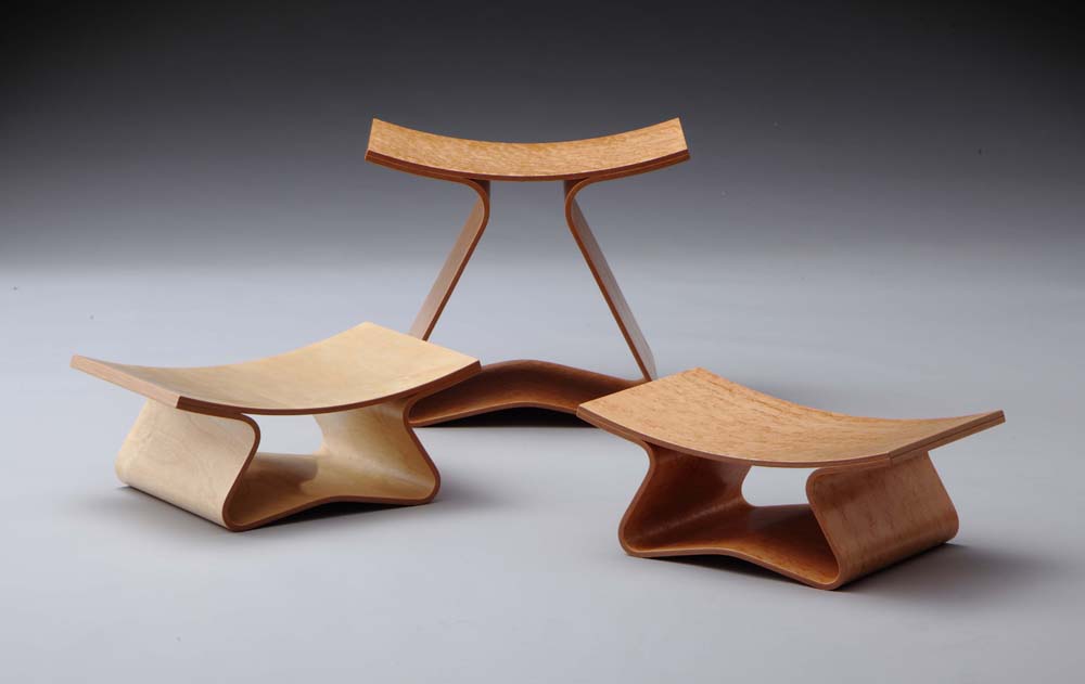 "Ghế thấp, ghế giữa" (Ghế thấp: 2009, ghế giữa: 2014) Ghế đẩu thấp có hình dạng thân thiện với chiếu được làm bằng hai tấm đơn giản uốn cong bằng gỗ dán.