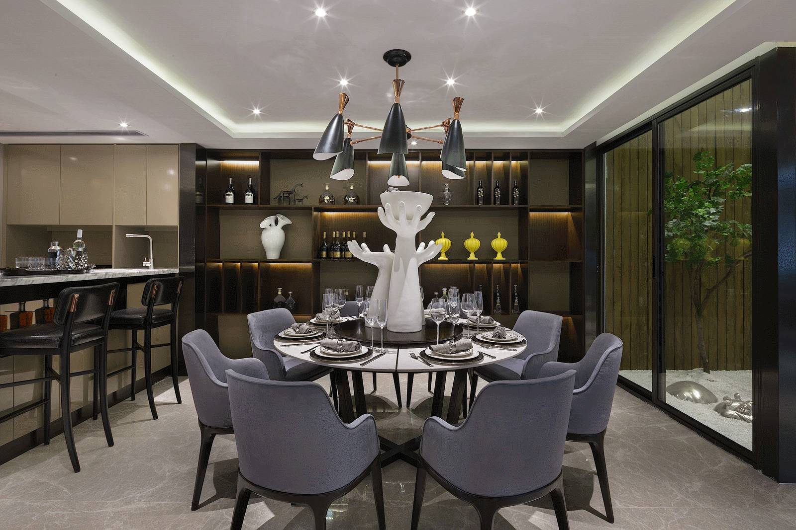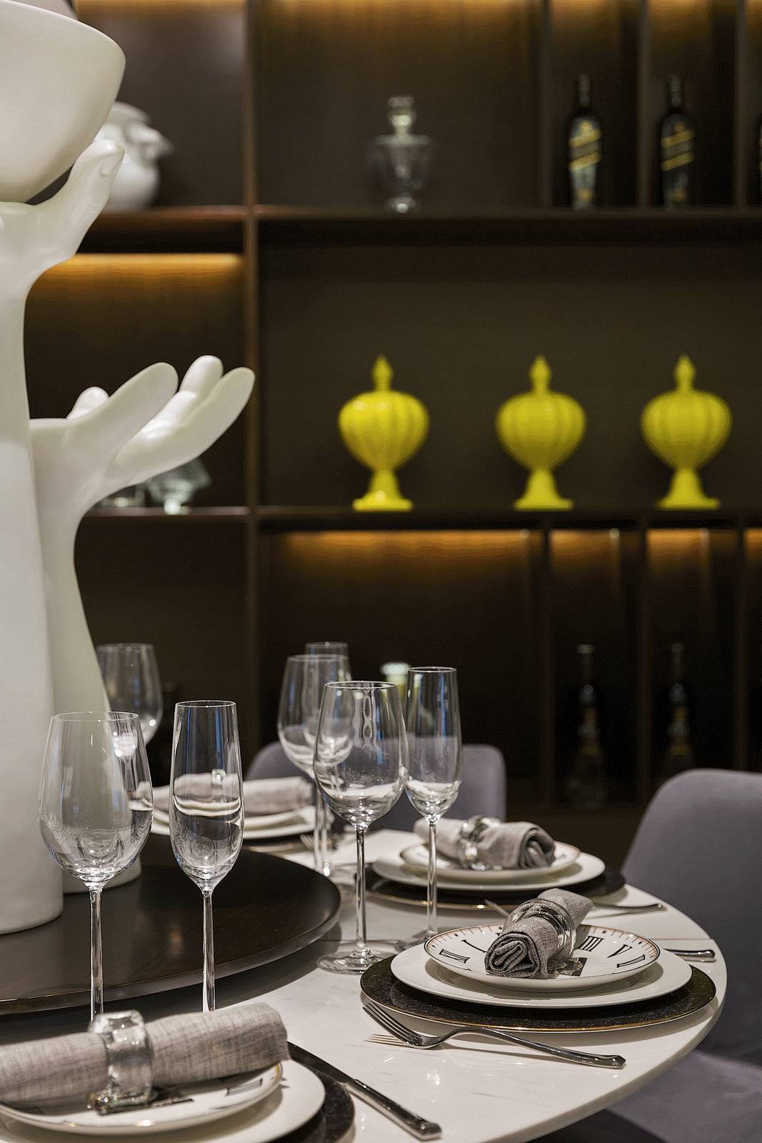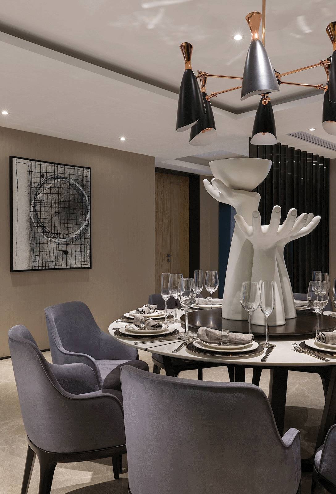 Bàn ăn toát lên vẻ sang trọng với lối thiết kế hoa mỹ, tận dụng những đồ nội thất cao cấp và sáng tạo thêm một bức tượng trưng bày ở trung tâm bàn.