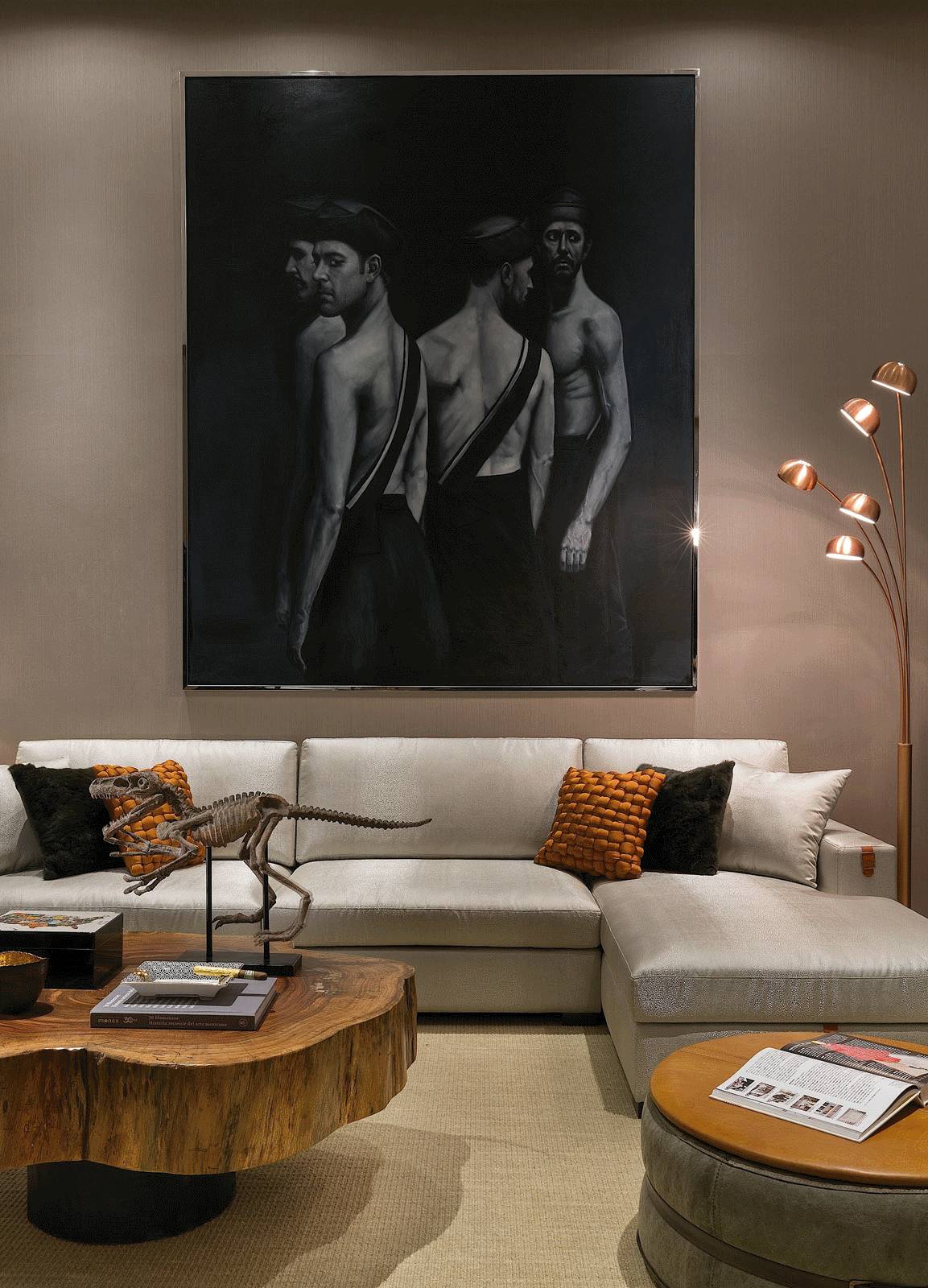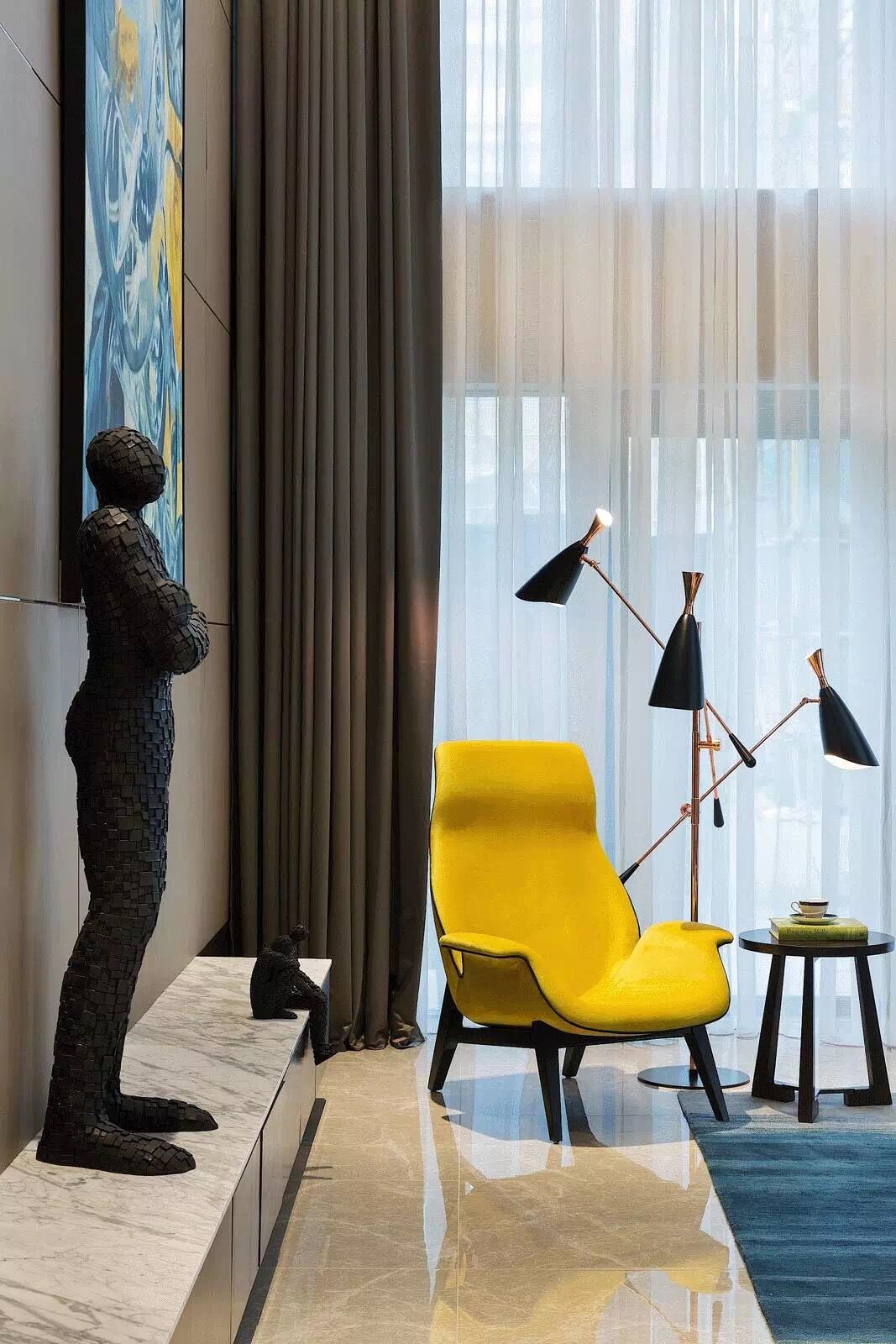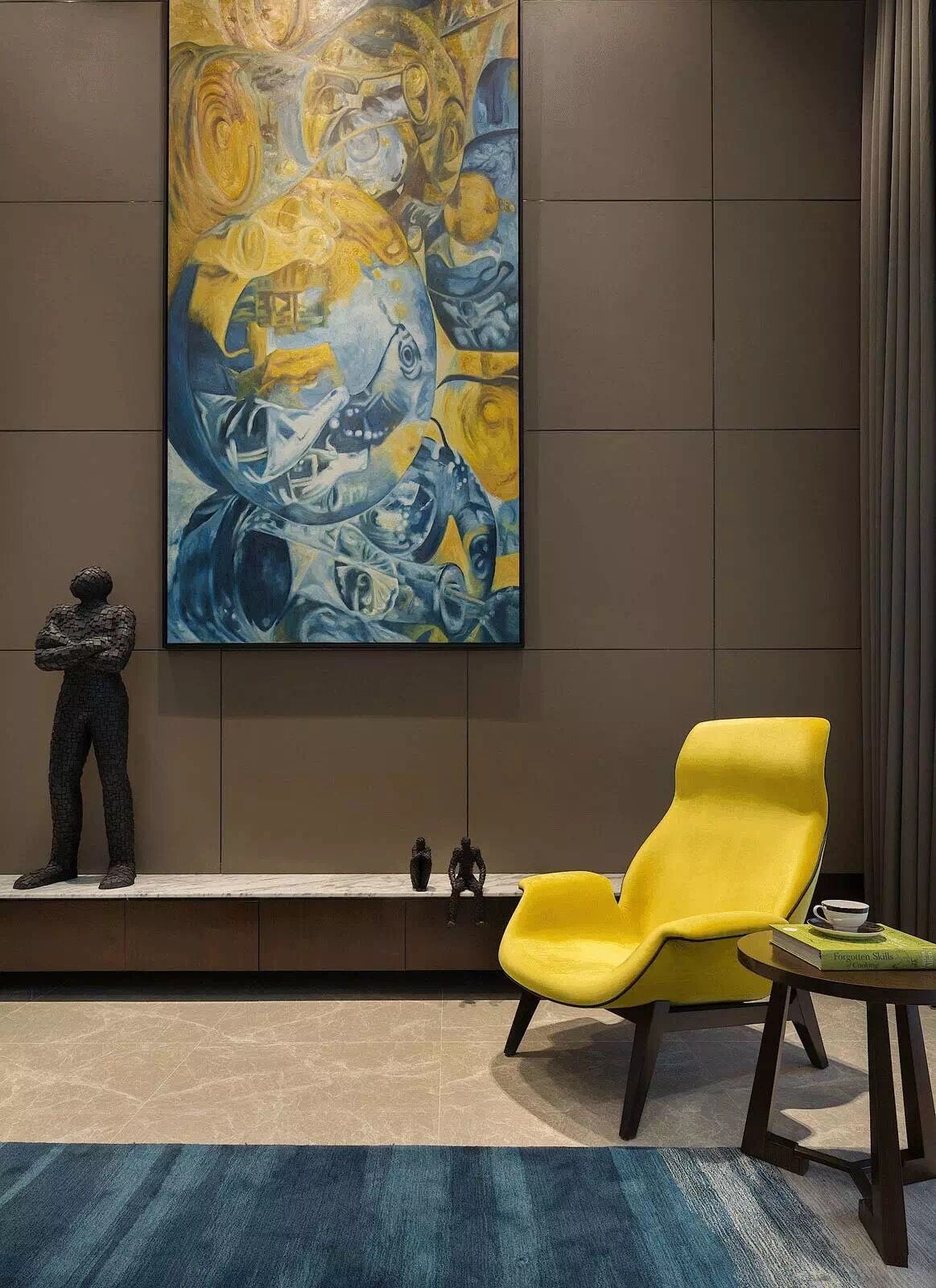Bức tranh nghệ thuật với đường nét đặc biệt, màu sắc tương đồng với màu vàng trong phòng, tạo nên một tổng thể hài hòa. Sẽ rất thiếu sót khi quên đề cập đến những bức tượng hình người với kích thước, tư thế khác nhau, đem đến cho căn phòng một vẻ huyền bí không tả nổi.