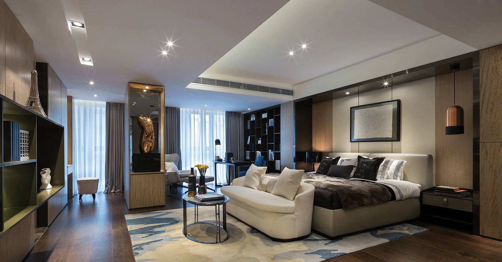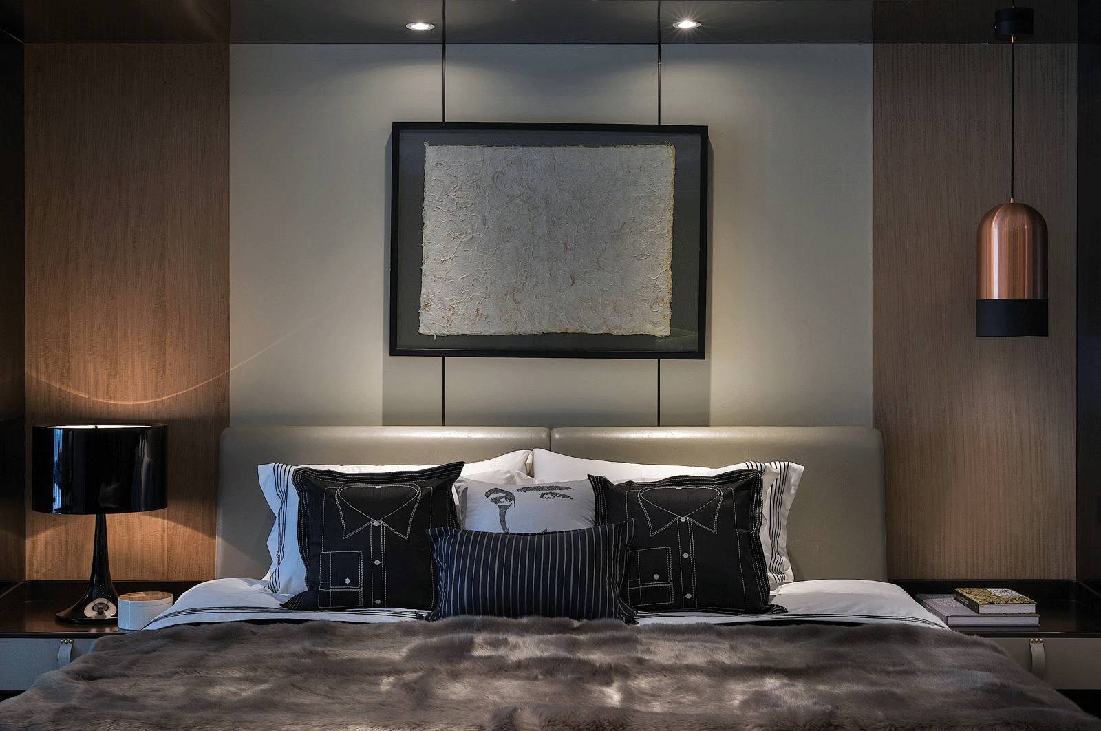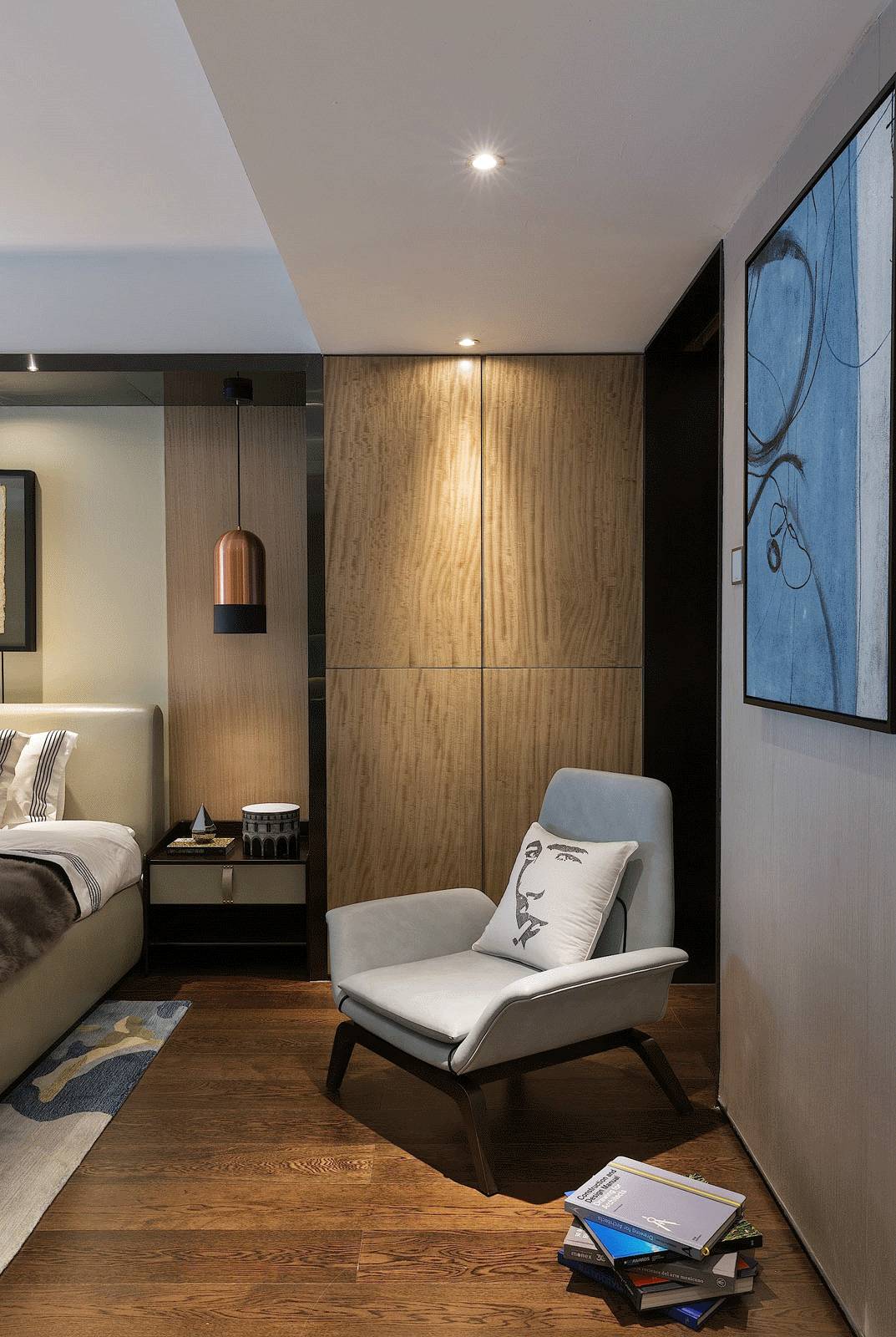 Phòng ngủ to rộng và ấm áp, đèn âm tường tạo cảm giác nhẹ nhàng, sâu lắng kèm với gam màu trầm sẽ khiến cho tâm trạng thoải mái hơn trước khi chìm vào giấc ngủ.